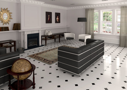 Gresie octogonala alb Bianco Ottagono 20x20cm + Taco Nero 5x5cm, portelanata, productie Italia